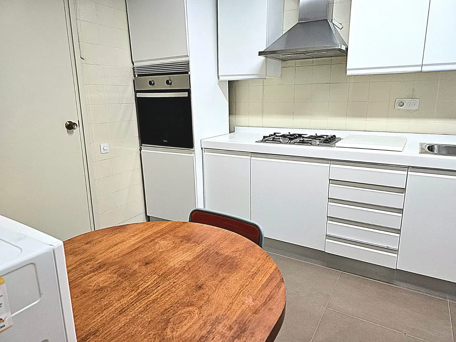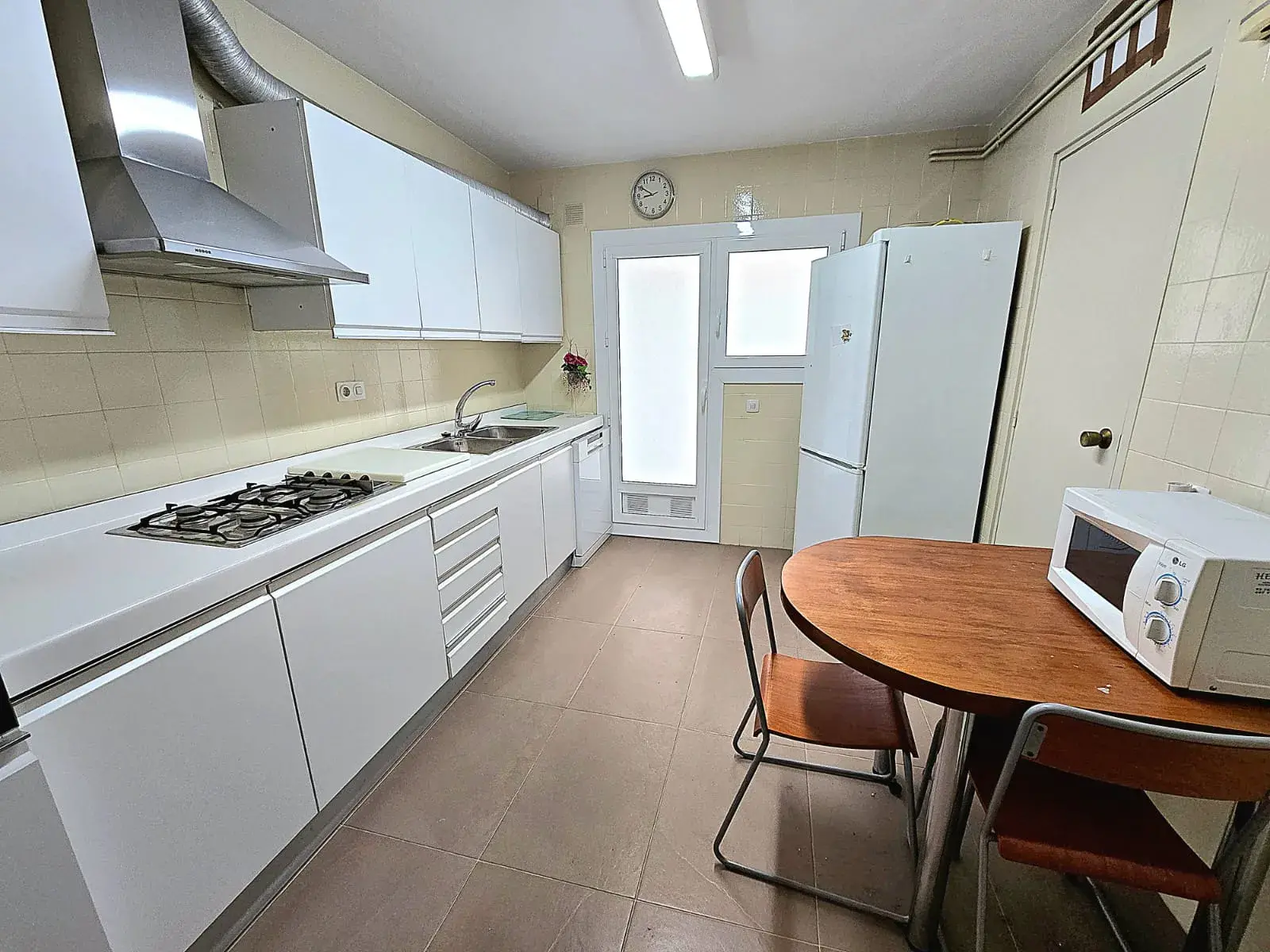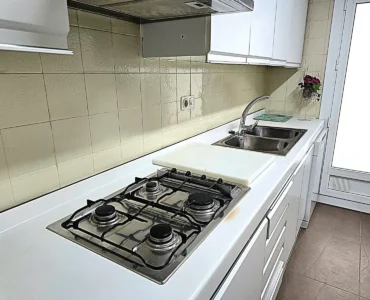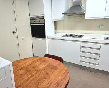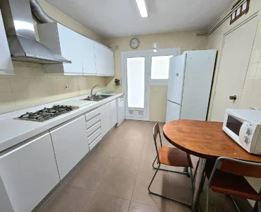 La cocina es independiente y muy espaciosa, completamente equipada con placa de gas, horno, campana extractora, frigorífico y zona de mesa para comer. Además dispone de salida a galería o zona de lavadero que aporta ventilación y funcionalidad.