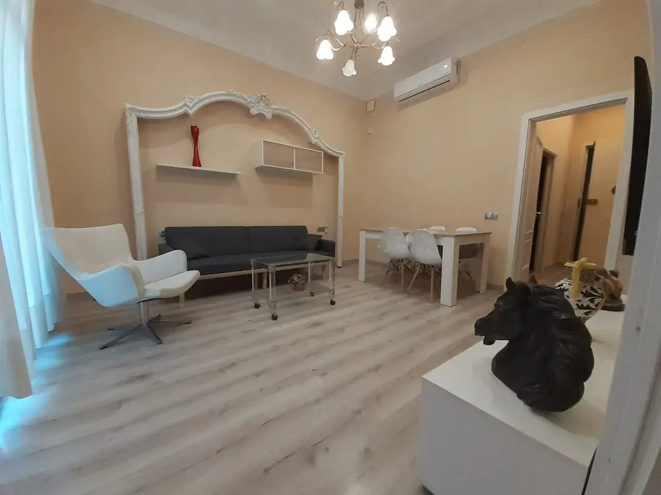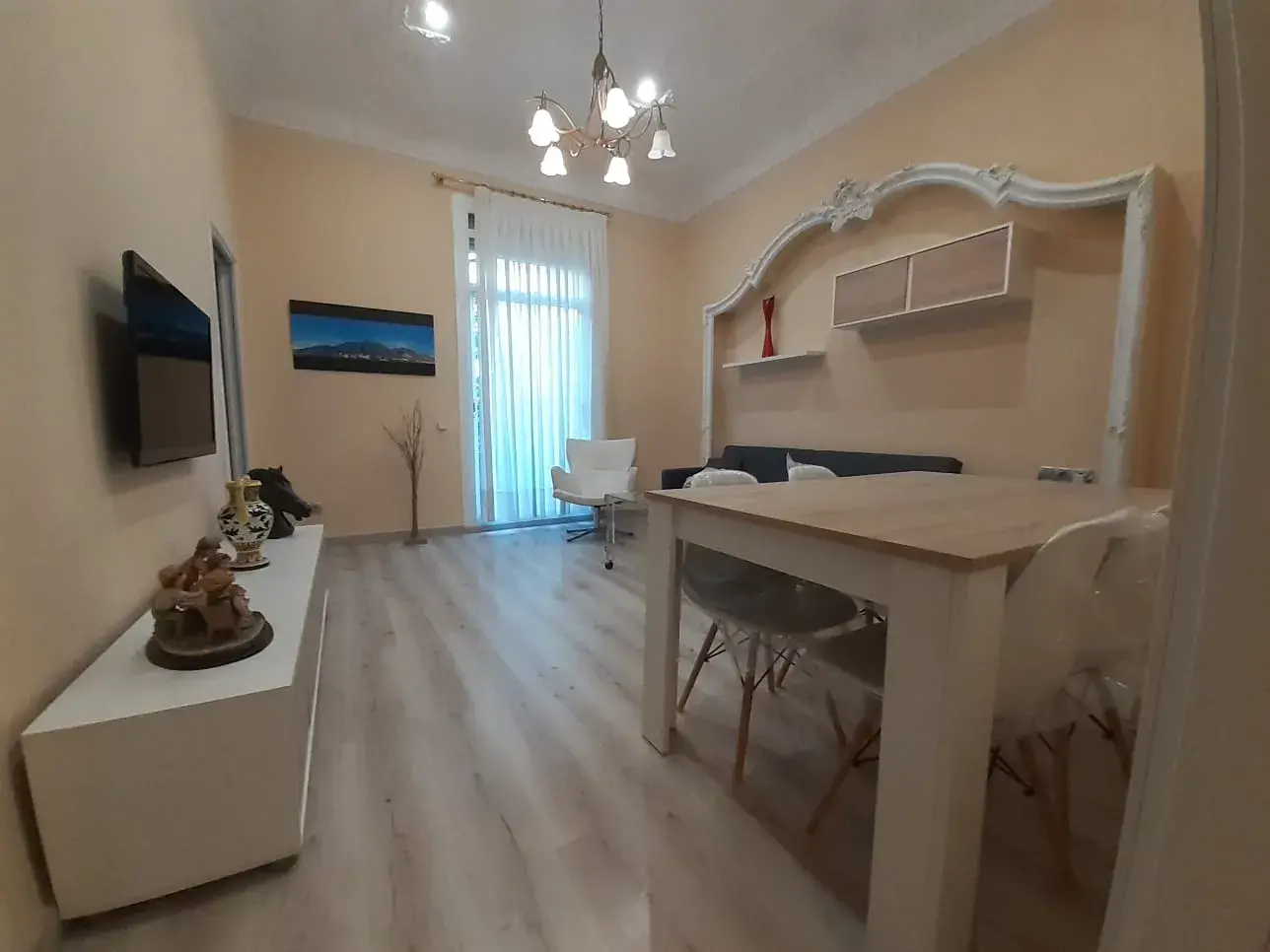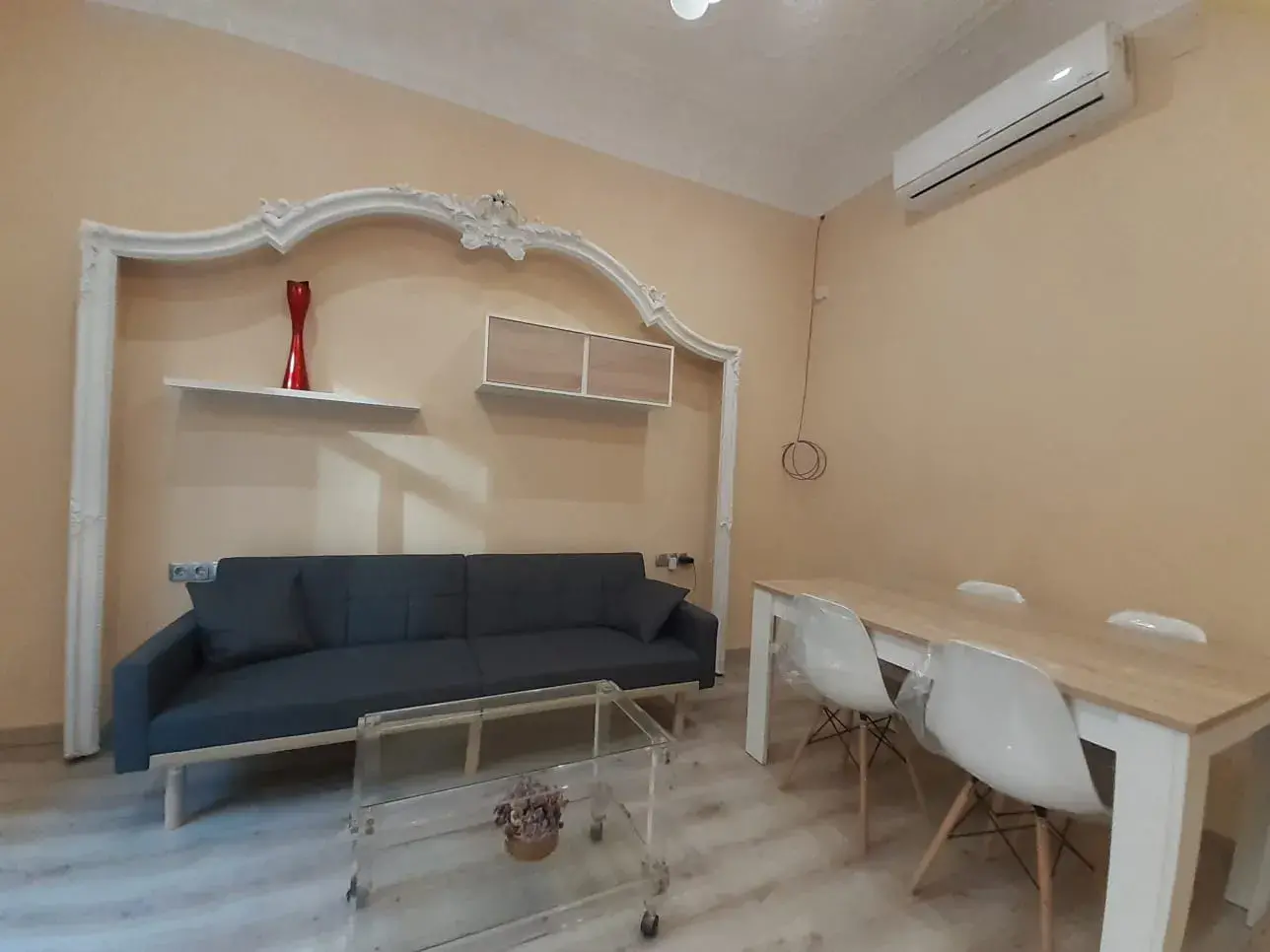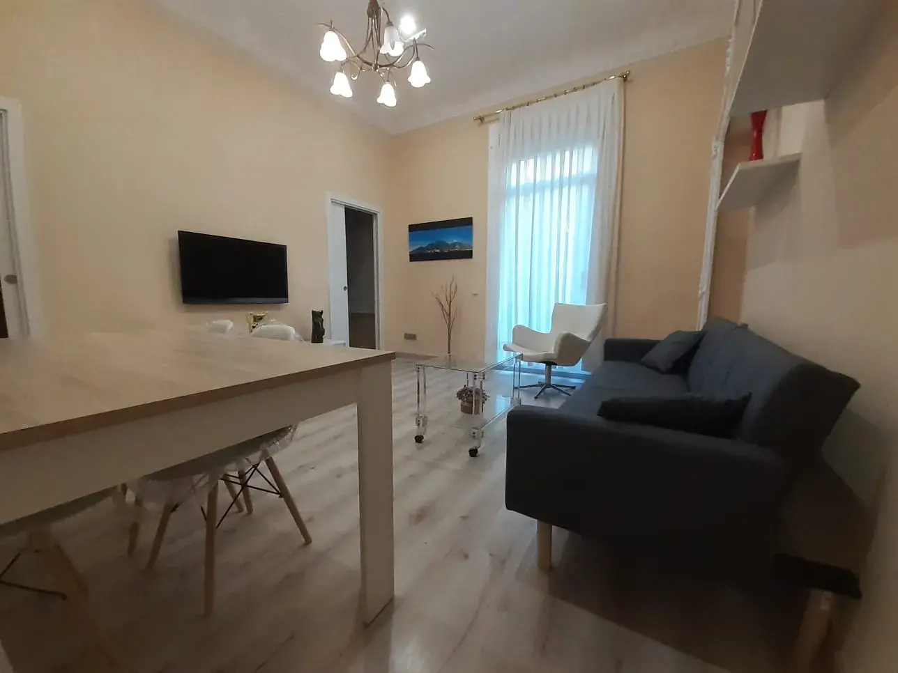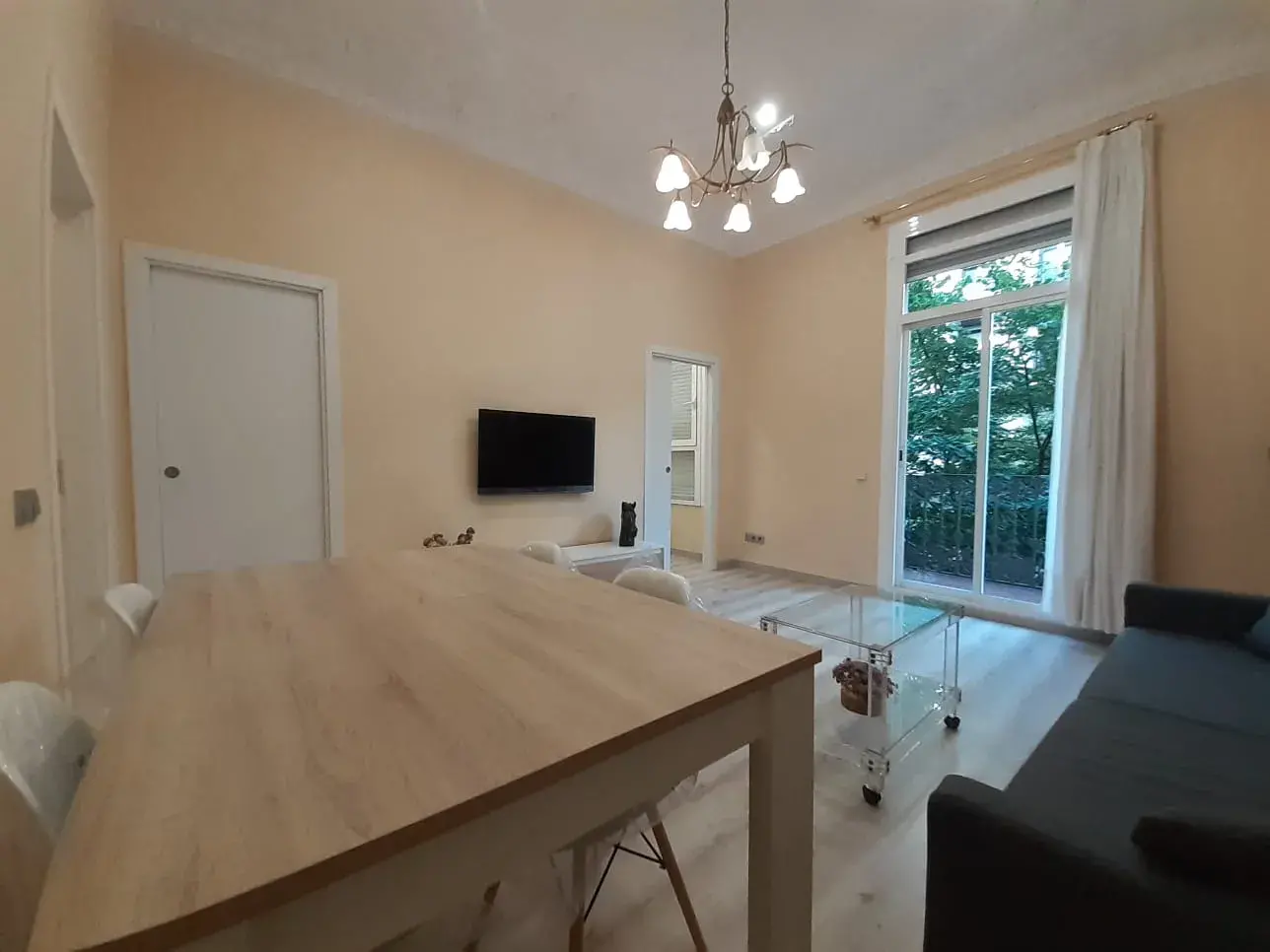 El apartamento cuenta con un amplio salón-comedor muy luminoso, con techos altos que aportan sensación de amplitud y elegancia. La zona de estar está cuidadosamente distribuida, con acceso a un gran ventanal que permite la entrada de abundante luz natural y conecta con el exterior, creando un ambiente cálido y agradable.